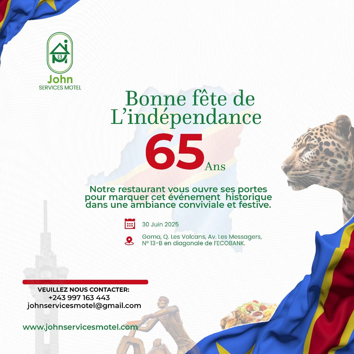 0997163443Bienvenue au Motel John Services ! Nous sommes ravis de vous accueillir dans un cadre confortable et chaleureux. Profitez de nos chambres propres à prix abordable, d’un restaurant avec des plats savoureux, ainsi que d’une salle de réunion idéale pour vos rencontres professionnelles. Merci de nous faire confiance. Votre confort est notre priorité !